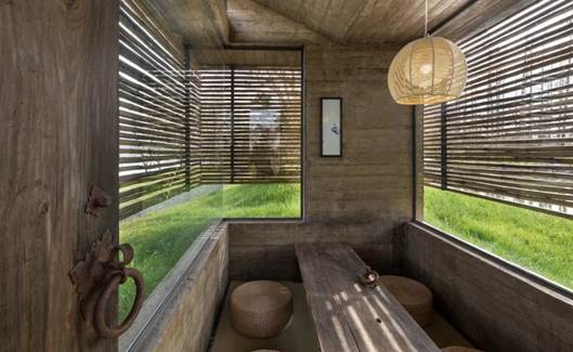 茶室由三片木纹混凝土结构墙支撑起水平挑檐横板,没有其他结构梁出现。木纹混凝土外表皮刷了清漆做保护,外挂竹百叶经过水煮处理,颜色也趋近木纹混凝土最后的颜色。北侧入口的挑檐挖了一个圆形洞口,将茶室名字“陆方”焊接在洞口一侧,会在入口墙面上很短暂的显示“陆方”两个字的影子。