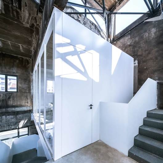 所以新设计是克制的,以较少的新的空间体量植入到旧的大空间里去。只在原来靠二层的一侧新建一个柱跨宽的夹层,以保留大部分的竖向空间格局。靠一侧设计了夹层的目的,是依靠天窗获得的长轴方向的序列感得以保留。夹层仅用一根直径200mm的柱子来支撑,加上折线楼梯,强化了夹层的重量和漂浮感。新的体量用纯净的白来体现,老的墙面仅清扫后刷墙面固化剂,保留了原有的烟熏火燎、甚至是脏的痕迹。