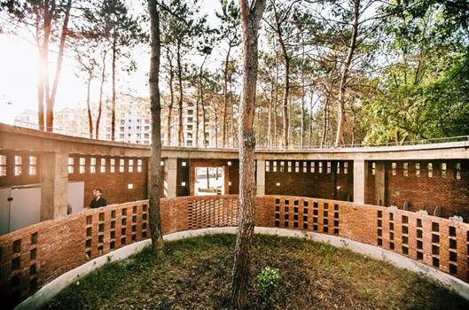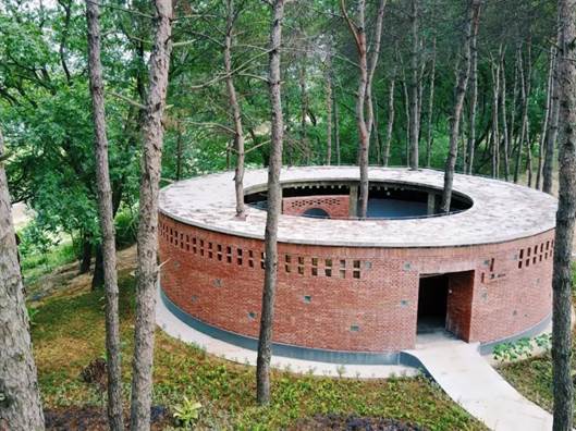 松树林遮天蔽日,在顶部形成了建筑的第二层“大屋顶”。环形的清水混凝土顶带给人只是屋檐的感觉,而松树带给人第二层自然屋顶的感觉。圆形内院把人的视线引向天空,1.2m高半遮挡的环形花格子墙,满足人的探知和好奇心理。为了保证几何形体的纯粹性,建筑材料-内、外墙都选择了清水红砖,耐脏、吸水,同时符合郊野公厕的卫生管理粗放的标准。红砖的花格式砌法,创造出多变的光影。圆形洞口透过的光使得这个环形厕所在一天的阳光变化下,投影不断发生变化。在清水红砖墙的立面,穿插砌筑了玻璃砖,玻璃砖在夜晚时候使得公厕变得具有标识性,使日常的公共建筑变得浪漫。