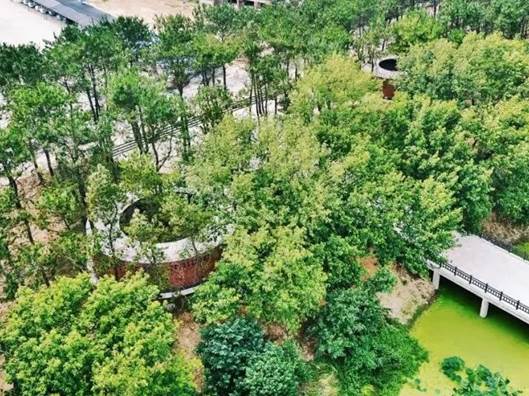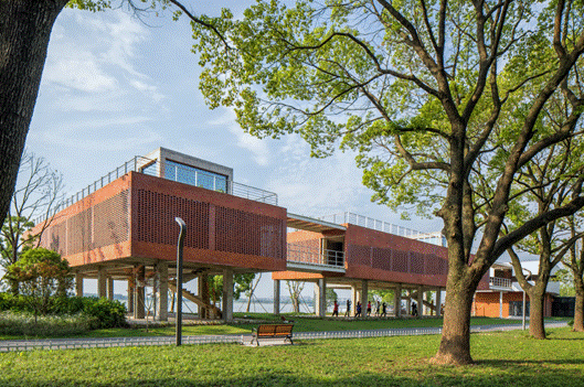 原有场地为沙场、趸船物流码头占用的江边滩地;更新改造后成为面向公众的开敞的滨水绿地空间。线性带状场地上,UAO合理规划开敞空间,通过缓坡堤防弱化防洪大堤的观感形成江、滩城无缝衔接的城市滨水空间。保留改造滩地的码头建筑变为文创空间,新增各种功能空间(如婚礼堂、木屋等)、利用堤防内部空间打造半地下停车库使得单一的绿化空间转变为复合的城市公园。
