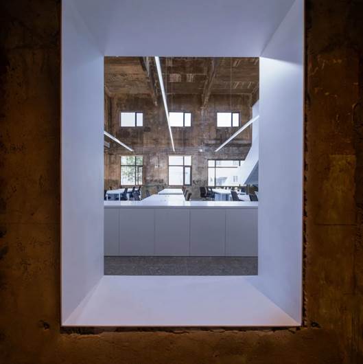 UAO办公的独栋小楼前身是工业厂区的发配电机房,原有发电机房总高度8m,如教堂般高耸,阳光从顶上的天窗和夹层的窗户倾泄下来,照耀着烟熏火燎过的、布满历史痕迹的老墙面。设计的出发点就是保留并发扬这个高耸空间感特质。
