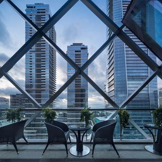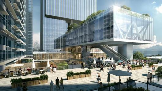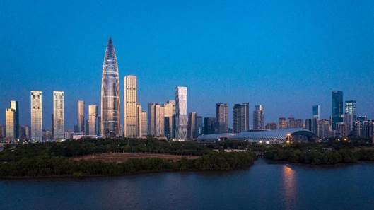 本项目位于深圳后海的核心区,与华润总部春笋比邻而立,立面寓意为晶莹剔透的水晶体,折叠幕墙表皮独特的形式体现了对滨海建筑(波浪)和金融建筑(钻石)的表达。