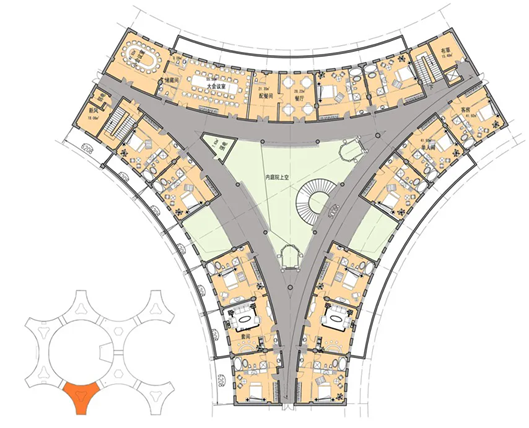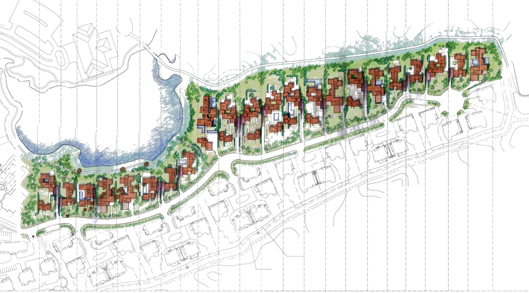 源于自然、融于自然”,整体形态延伸高尔夫球场流畅开阔的景观特征和起伏有致的地貌特点,南区采用苜蓿叶组团,增大了地势起伏的可能性。北区建筑单体沿湖面和球场方向顺势伸展。