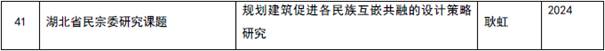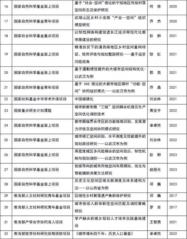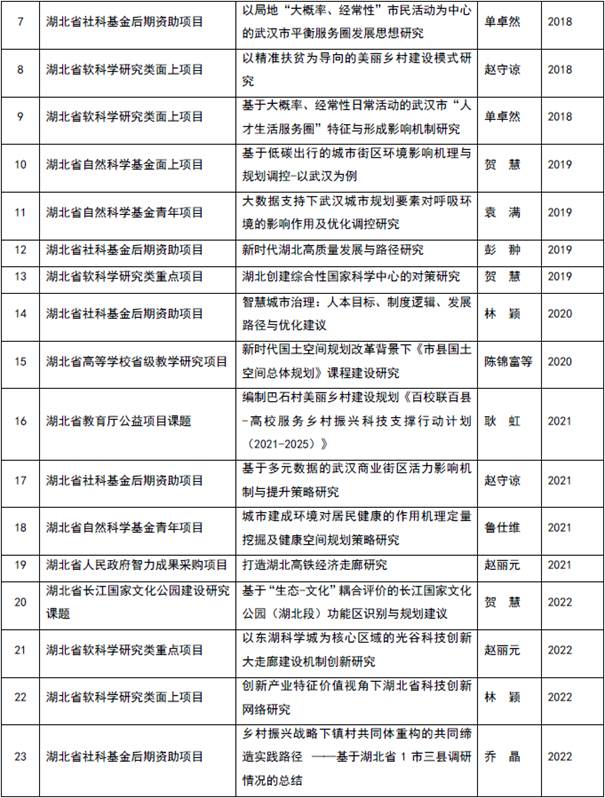 2016年以来,城市规划系教师屡次荣获教育部高校科研优秀成果奖、湖北省科技进步奖、湖北省社会科学优秀成果奖等科研奖励。其中,黄亚平教授、何依教授获评首批“湖北规划设计大师”荣誉称号;耿虹教授的精准扶贫十大典型项目《科学精准规划,共建美好家园》、教育部直属高校非遗扶贫示范创建项目,连续两年获教育部高校科研优秀成果奖(人文社科)咨询服务报告奖;何依教授的“工业遗产再利用的建筑设计及关键技术”获湖北省科技进步三等奖;何依教授著作《四维城市——城市历史环境研究的理论、方法与实践》荣获湖北省社会科学优秀成果三等奖;贺慧教授《可食地景》入选湖北省教育厅2019-2021年度高等公司哲学社会科学社会研究优秀成果。
