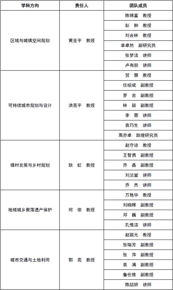 近年来,城市规划系教师队伍扩充迅速,体系结构不断完善。现已分别形成由黄亚平教授、洪亮平教授、耿虹教授、何依教授、郭亮教授为学术带头人的五大学科团队(团队名称及成员见下表所示)。学科实力在国内(尤其在中部地区)建筑规划院校中处于领先地位。