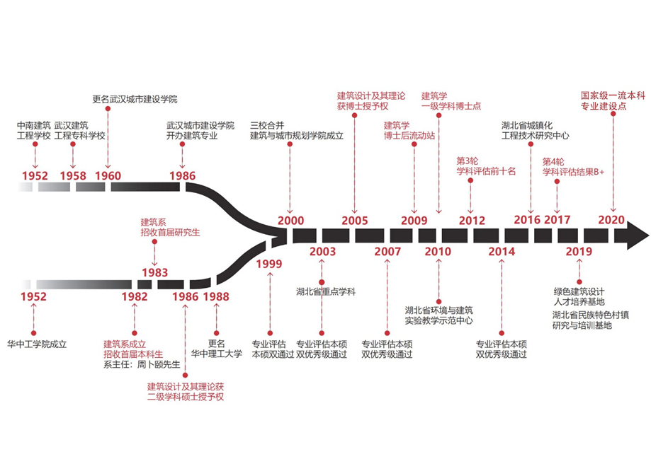 2000年,建筑学系由原华中理工大学建筑学系与原武汉城市建设公司建筑学系组成。原华中理工大学建筑学系成立于1982年,当年9月招收首届本科生及硕士研究生,周卜颐教授出任首届系主任。原武汉城市建设公司是经国务院批准的我国第一所城市建设公司,源于1952年12月3日成立的建筑工程公司,是建设部直属高校之一,1986年开办建筑学专业。原华中理工大学和原武汉城市建设公司均是我国建筑学科和人才重要的培养基地。