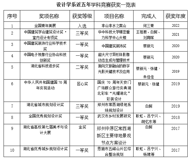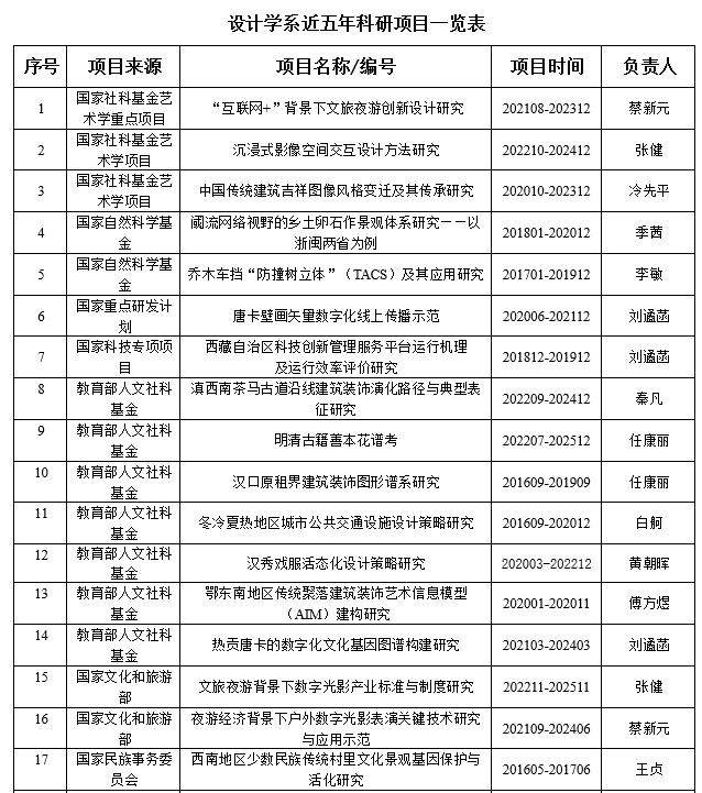 多年来承担了国家社会科学基金艺术学重点及面上基金、国家自然科学基金、教育部人文社科基金、国家重点研发计划、国家科技专项、国家文化科技创新工程、省部级基金等20余项。近五年师生参加国内外竞赛获奖近200项,其中在教育部顶级创新创业赛事互联网+中获全国金奖2项、银奖1项,获得中国建筑学会国家级一等奖25项,园冶杯景观设计竞赛一等奖10项,老员工网络设计竞赛一等奖25项,全国老员工计算机设计大赛一等奖10项。